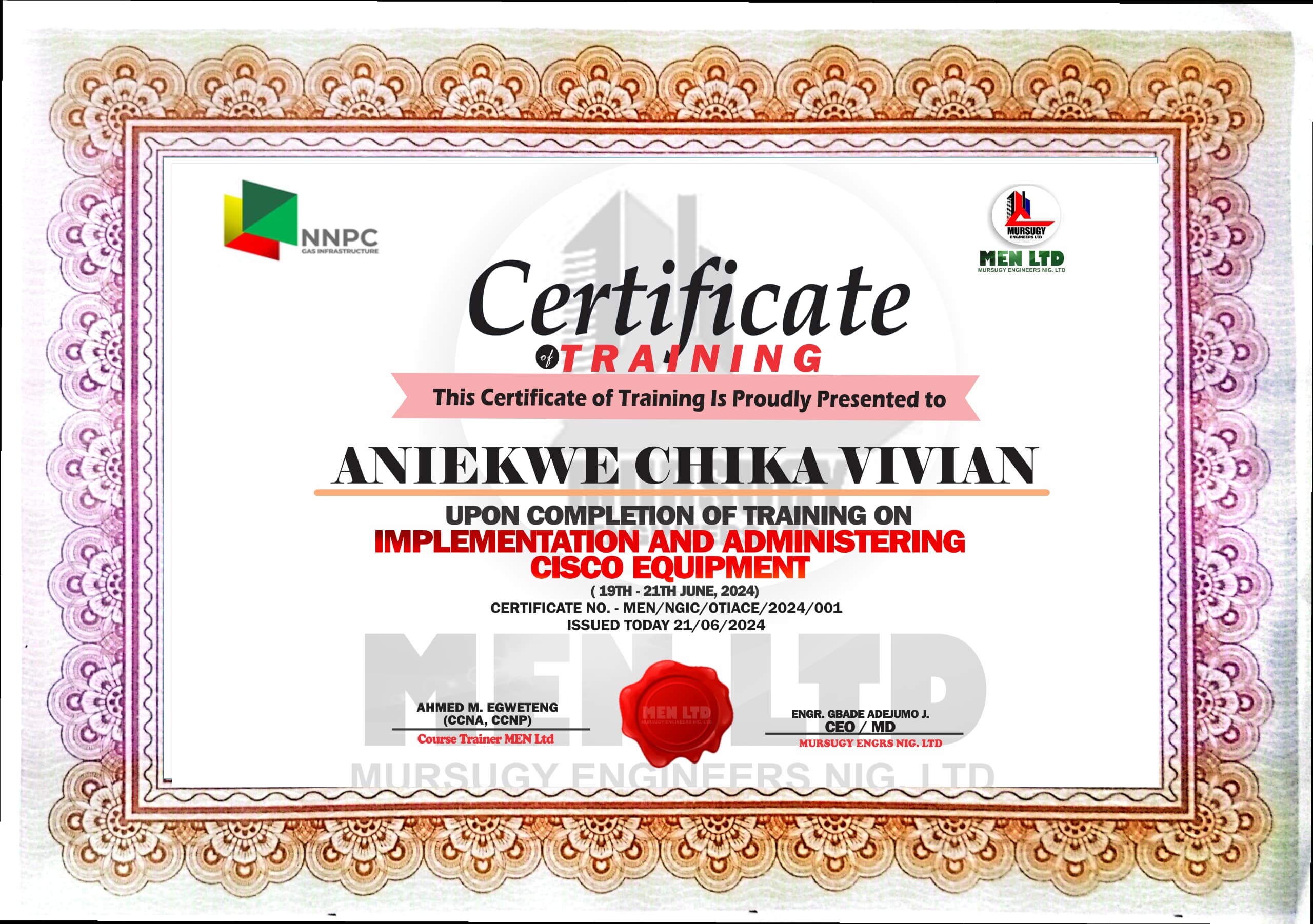 SAMPLE CERTIFICATE PRESENTED UPON COMPLETION OF TRAINING OF CISCO EQUIPMENT TO THREE NNPC-NGIC STAFF AFTER THE EXECUTION OF OUR PROJECT ON PROVISION AND INSTALLATION OF STRUCTURED LAN CABLING AT ONNE METERING STATION, PORT HARCOURT.